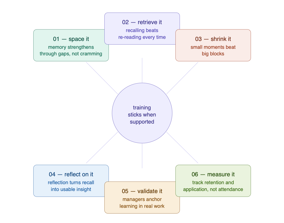 Learning science has been remarkably consistent on this point. Knowledge sticks when it is revisited, recalled, reflected on, and applied over time. When those elements are missing, even the best training fades quickly.